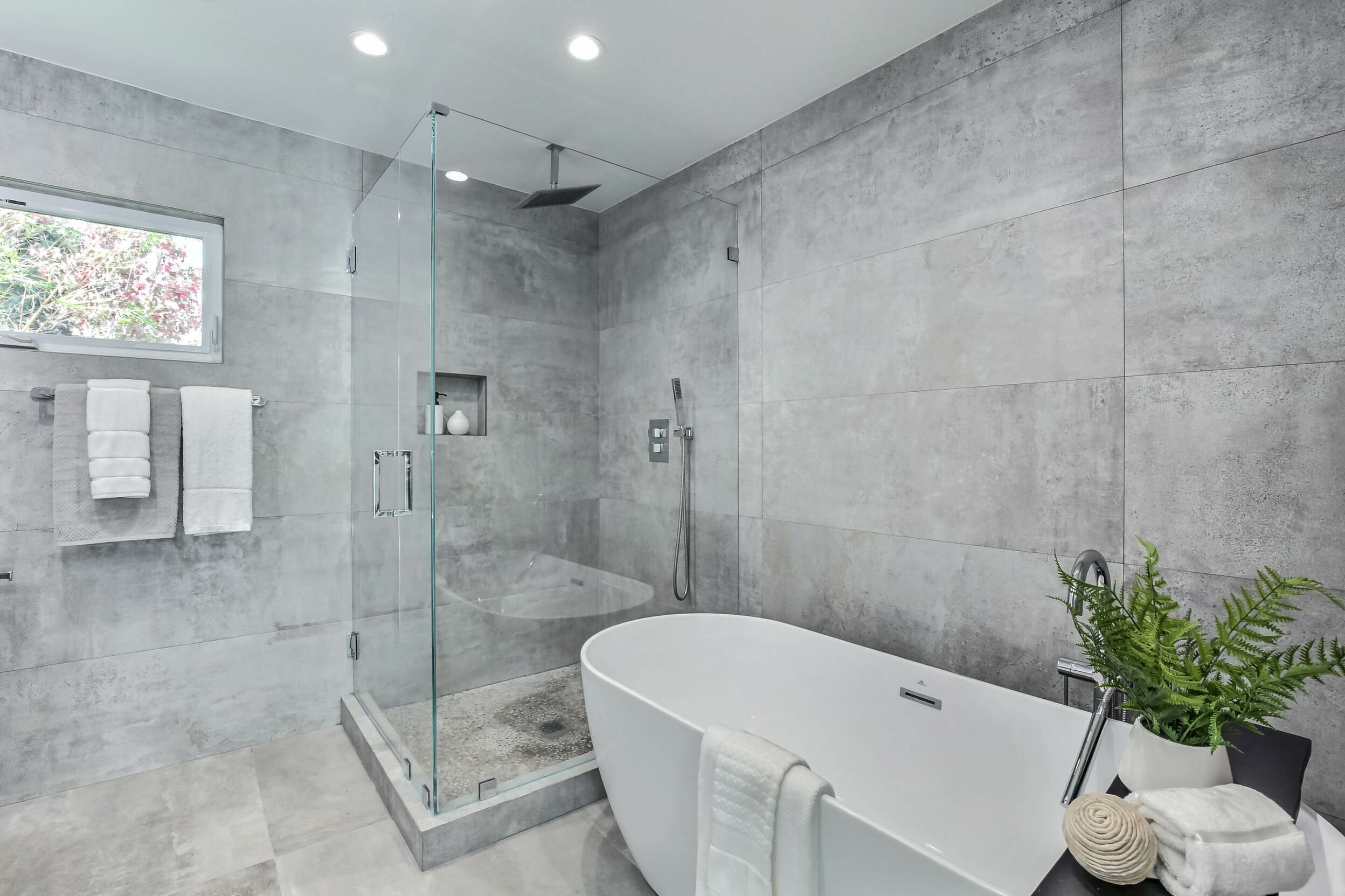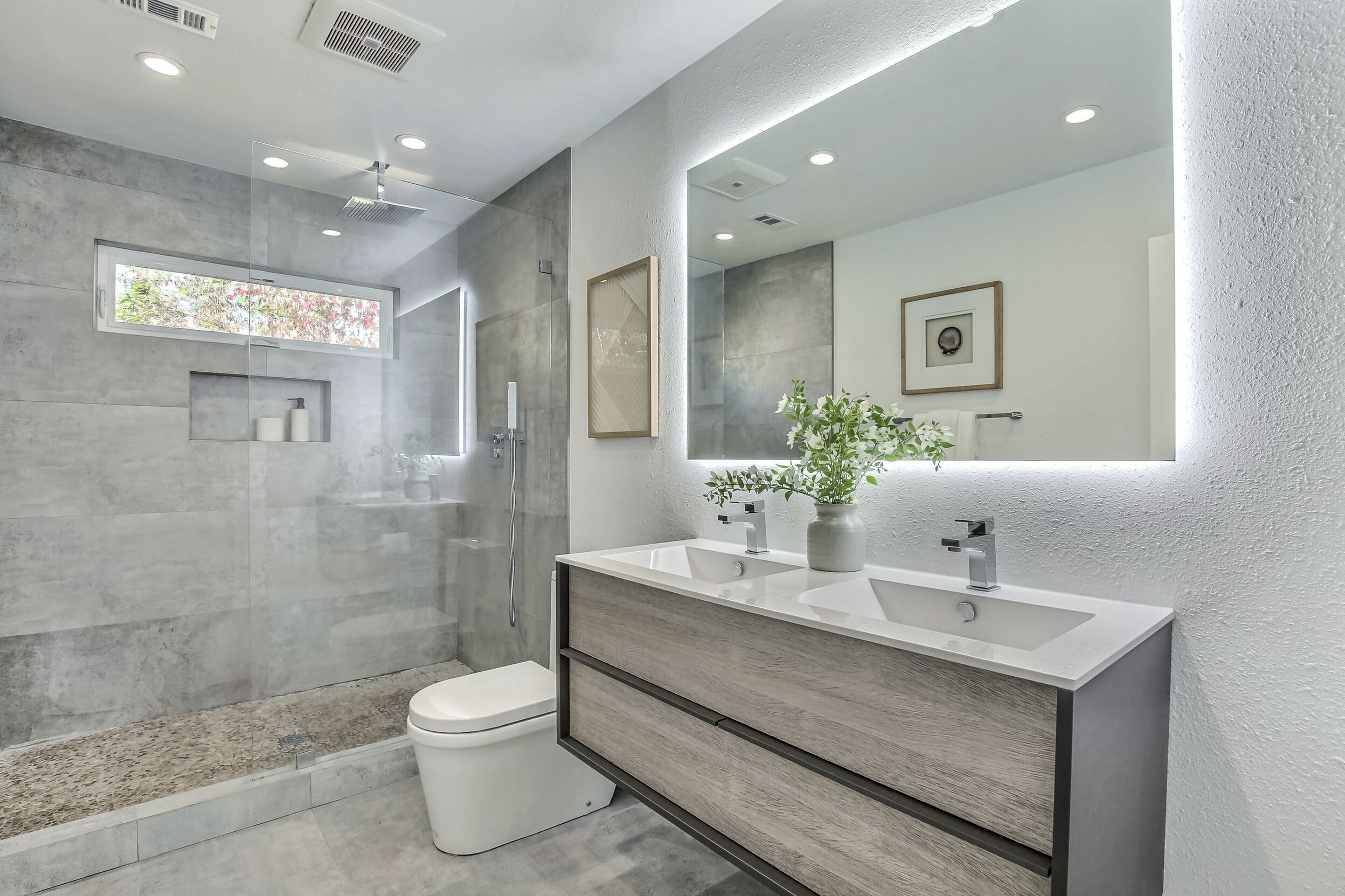 Secondary bathrooms echo the same high-end finishes with sleek floating vanities, modern tile, & frameless shower enclosures.
